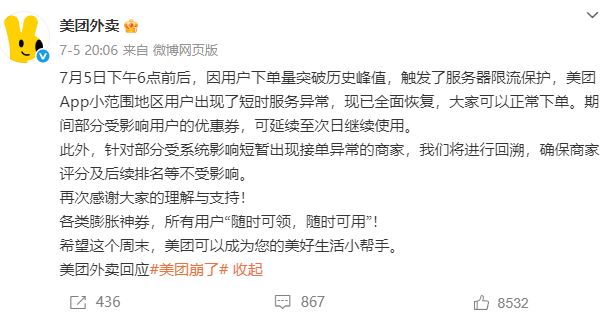今年,美团外卖曾多次出现服务异常,7月5日下午6点前后,因用户下单量突破历史峰值,触发了服务器限流保护,美团App小范围地区用户出现了短时服务异常。